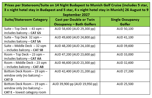 Inclusions, pricing and various conditions of this escorted golf cruise are detailed below for all category suites and rooms (other than OS – as not available):